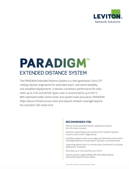 Extended Distance Solutions ATLAS-X1™ SST Cat 6A UTP MILLENNIUM™ System OneReach™ PoE Extender System PARADIGM™ Extended Distance System Network Connectivity Data Center Handbook Network Solutions Catalog OPT-X™ Systems Selection Guide OneReach™ Catalog Networks for Healthcare Facilities Networks for Education Download the Leviton 2 Go App BERK-TEK Cable Enterprise Fiber Line Card Copper Cable Reference Guide Fiber Simplification